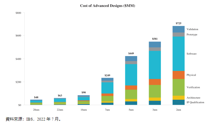 開發尖端産品所需的資源非常巨大,并且随着制造工藝節點的縮小而持續呈指數級增長。根據IBS的數據,7nm芯片的IC設計成本約為2.49億美元,2nm芯片的IC設計成本約為7.25億美元,與7nm芯片相比,設計成本大約增加了三倍。